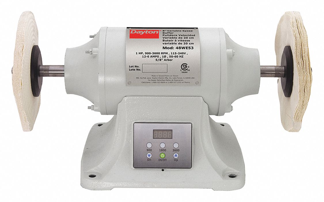 Dayton 2fdb5 premium bench grinder wheel dia 6 in max rpm 3450 3 4 hp voltage 120 230 7 5 3 75 amps ac 1 phase 60 hz arbor hole 1 2 in face wheel dimensions 1 in wheels center center 16 1 2 in length 21 in height 13 in dust collection exhaust port 2 1 2 in wheel material aluminum oxide 36 60 grit includes grinding wheels electronically controlled variable speed with led readout.